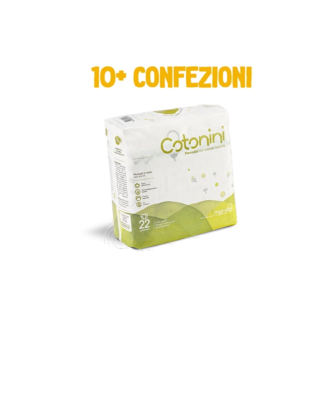 La nostra linea di Pannolini Cotonini si presenta in due formati: i Cotonini Classic, custoditi nel pratico e conveniente packaging salva-spazio, e i Cotonini Greenbox, contenuti in un astuccio di carta riciclata.