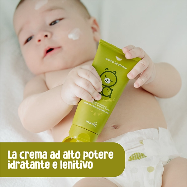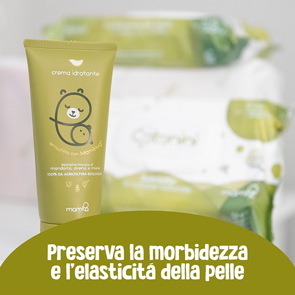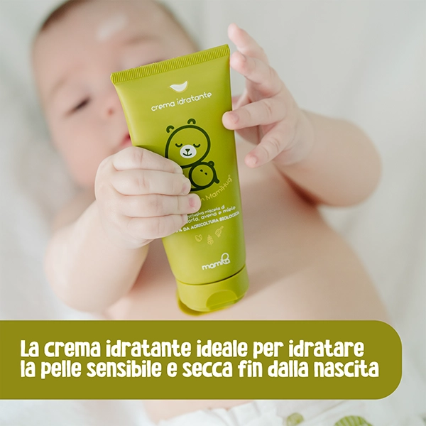 Crema idratante a rapido assorbimento per viso, corpo e mani, ideale per idratare la pelle sensibile e secca sin dalla nascita, proteggendola inoltre dall’aggressione di agenti esterni, arricchita con MamiHug miscela di Miele Avena e Mandorla 100% da agricoltura biologica.